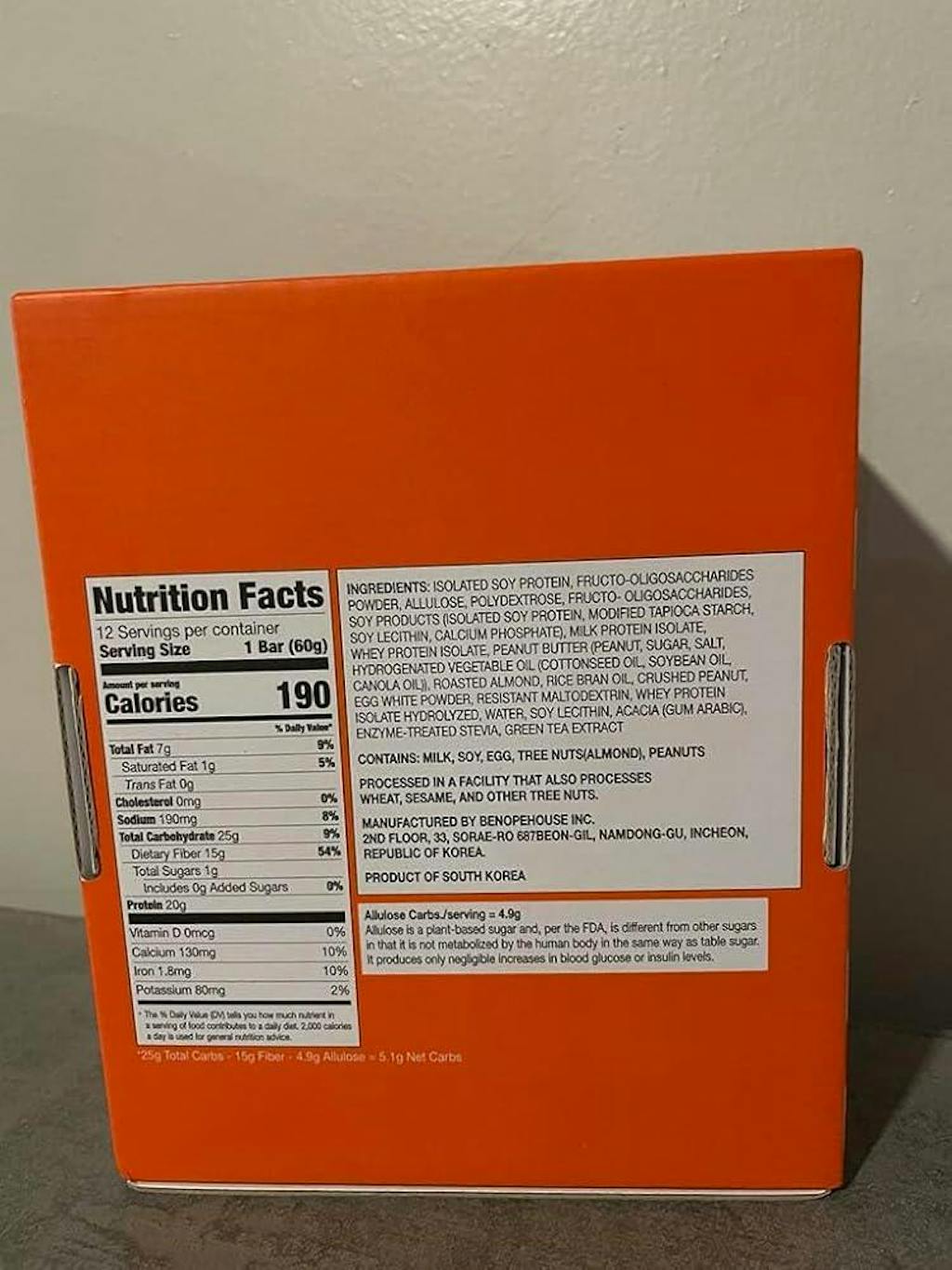 Isolated Soy Protein, Fructo-oligosaccharides, Allulose, Polydextrose, Soy Products, Milk Protein Isolate, Whey Protein Isolate, Peanut Butter, Roasted Almond, Rice Bran Oil, Crushed Peanut, Egg White Powder, Resistant Maltodextrin, Hydrolyzed Whey Protein Isolate, Water, Soy Lecithin, Acacia, Enzyme-treated Stevia, Green Tea Extract. Contains: Milk, Soy, Egg, Tree Nuts (Almond), Peanuts Net Carbs: 5.1g (25g Total Carbs - 15g Fiber - 4.9g Allulose)